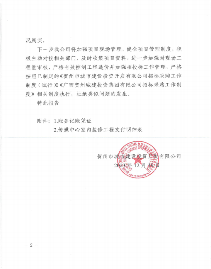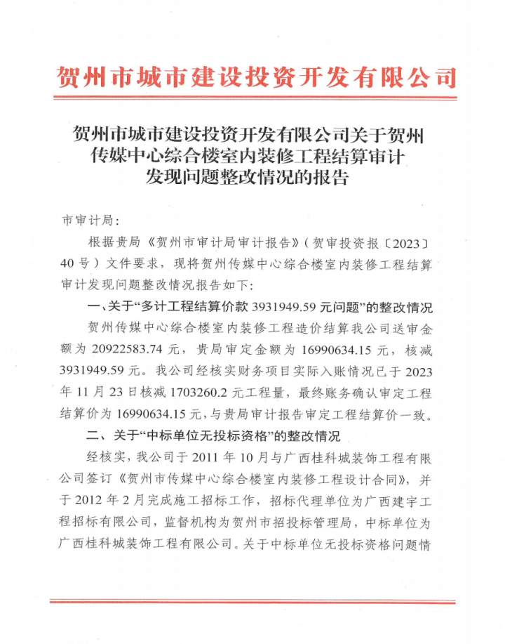 關于賀州傳媒中心綜合樓室內裝修工程結算審計發現問題整改情況的報告